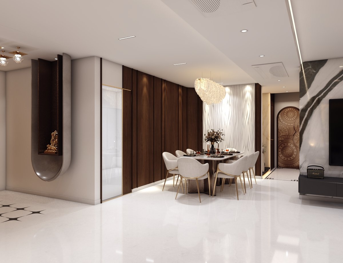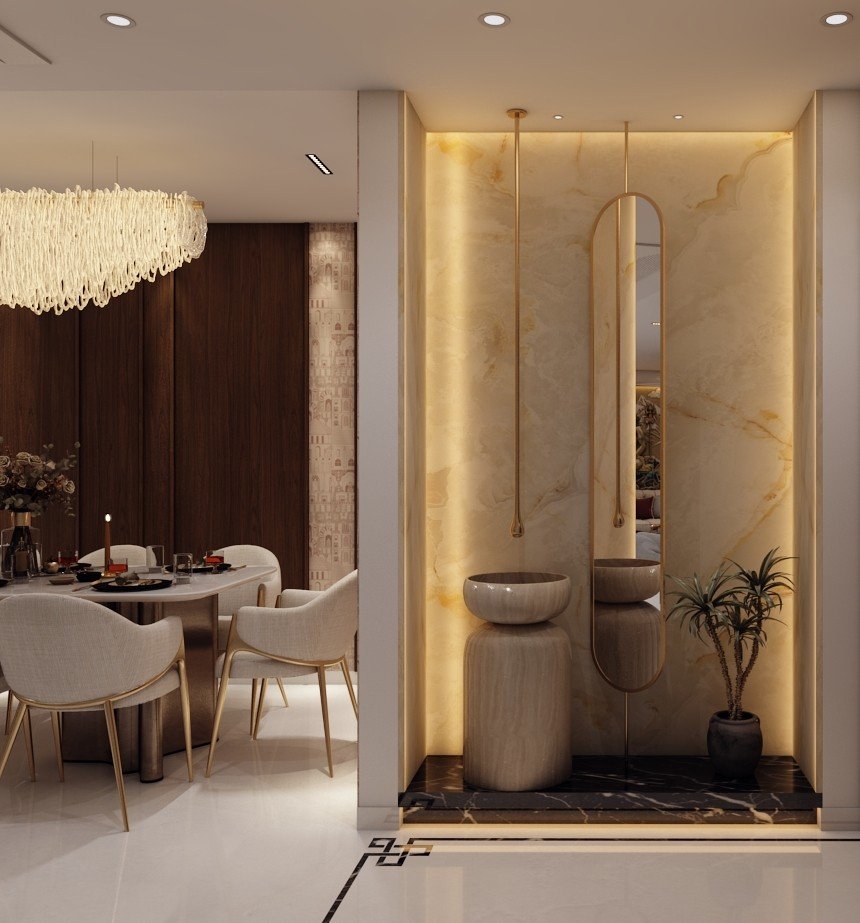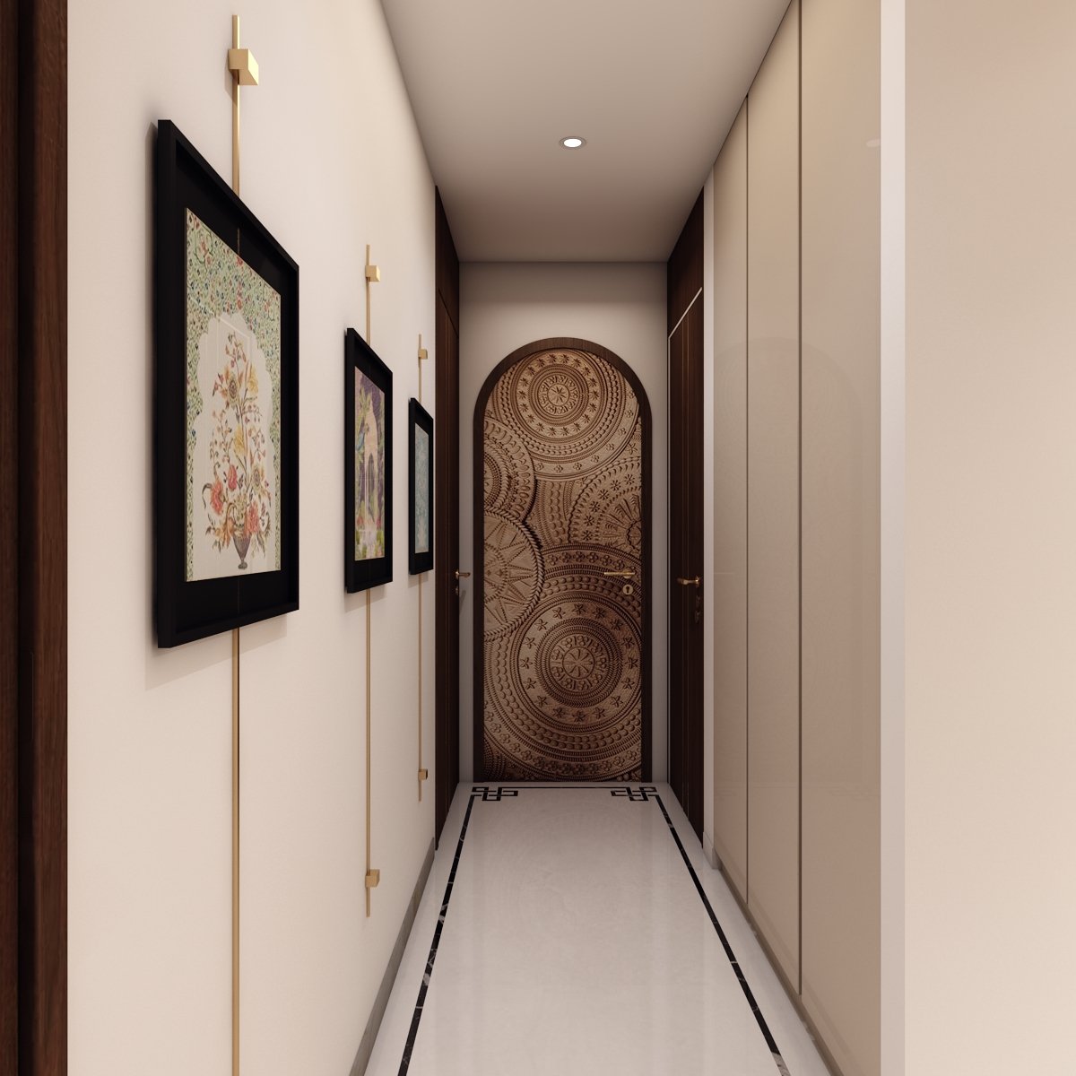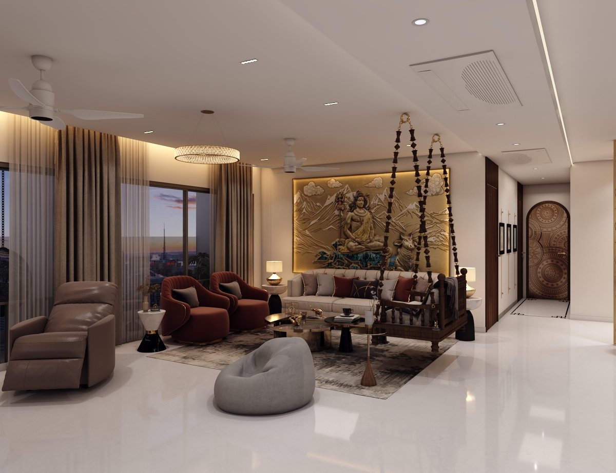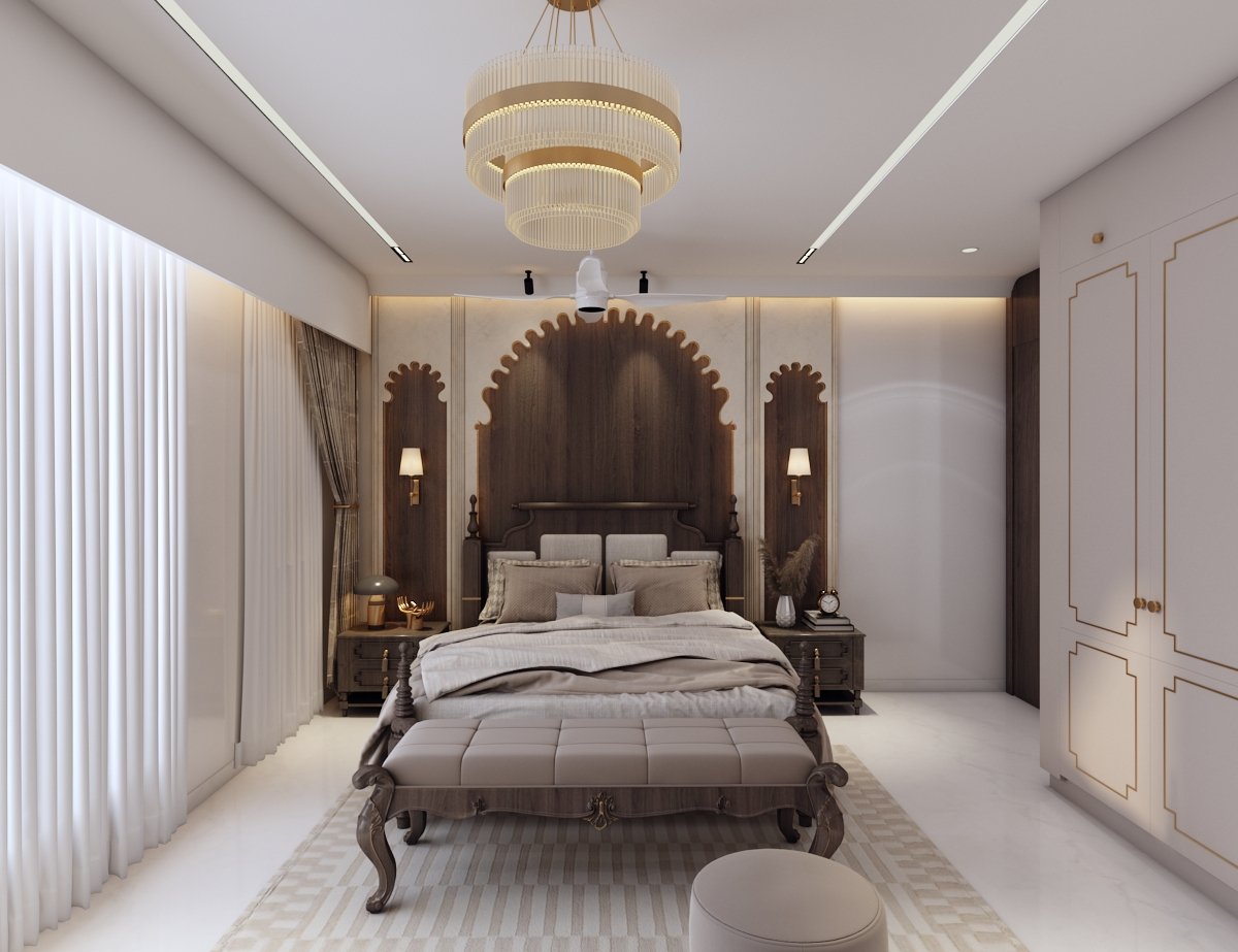 This 6BHK residence blends contemporary elegance with subtle Rajasthani charm. Clean lines, neutral tones, and modern layouts are enriched by traditional elements like carved wooden panels, jharokha-inspired niches, and patterned tiles. Sleek furniture is paired with vibrant textiles, mirror work, and hand- crafted decor accents. Spacious interiors feature open plans and natural light, while select rooms showcase heritage motifs and arches. The design balances modern functionality with the warmth and artistry of Rajasthan’s rich cultural heritage.